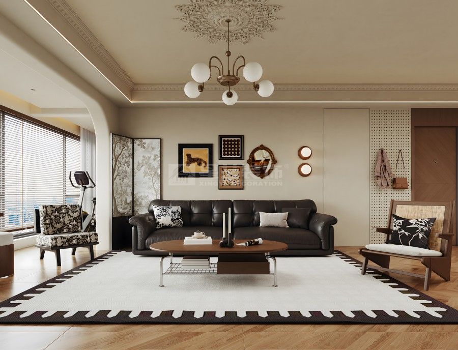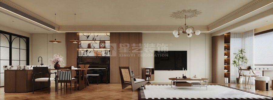本空间以「复古与现代共生」为设计内核,将法式线条的优雅与现代简约的实用相融。深棕木调打底,搭配人字拼地板与石膏雕花顶,勾勒温润质感;大理石、长虹玻璃等材质碰撞,弱化空间边界。钢琴区与客餐厨一体化布局,在保留古典韵味的同时,用简洁的柜体、柔和的灯光营造松弛感,让复古风情落地于当代生活。
