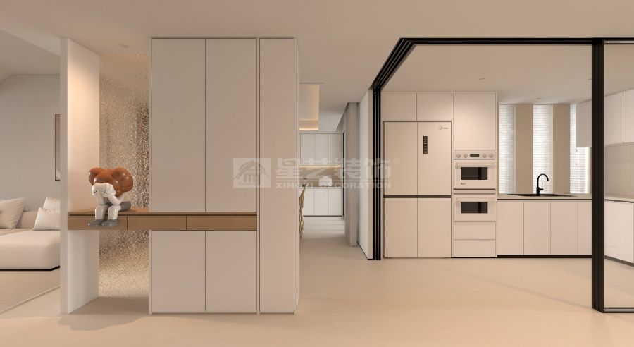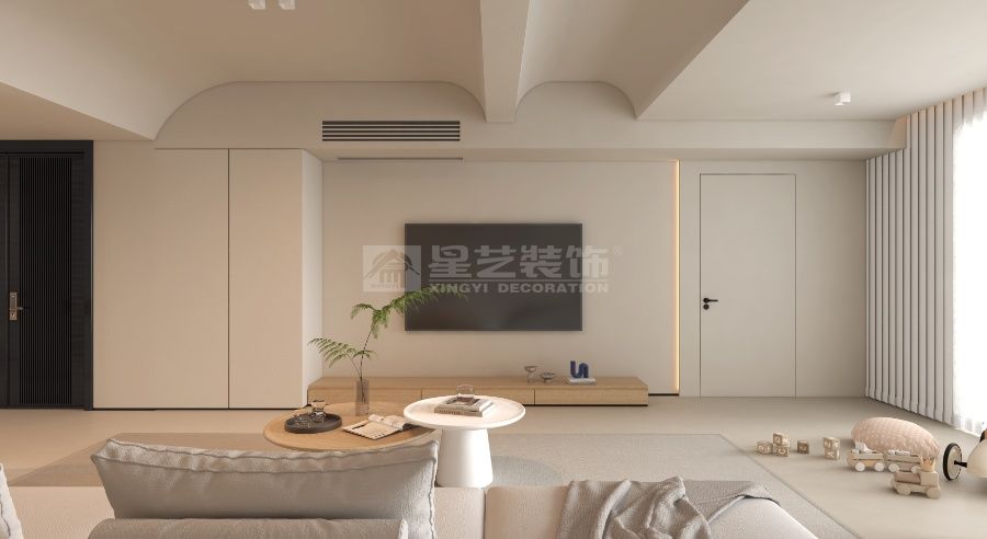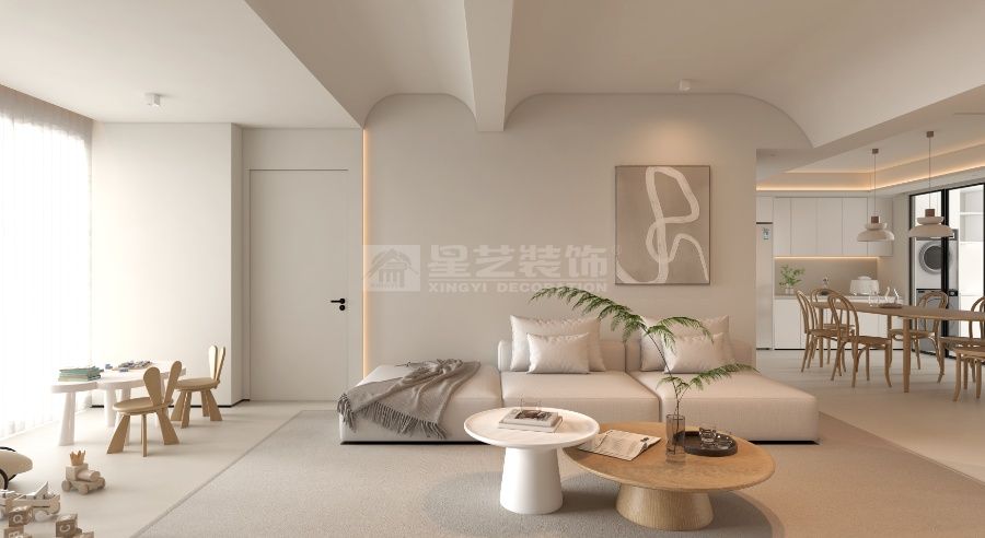 以奶油色为基底,用圆弧顶、柔光灯带柔化空间,搭配原木与浅色调软装,兼顾亲子互动区的温馨与餐厨通透感,营造松弛治愈的轻居氛围。