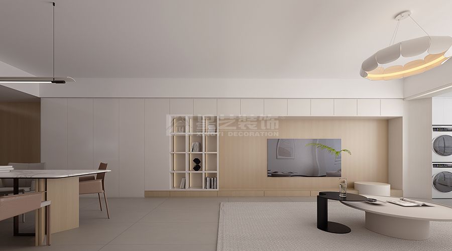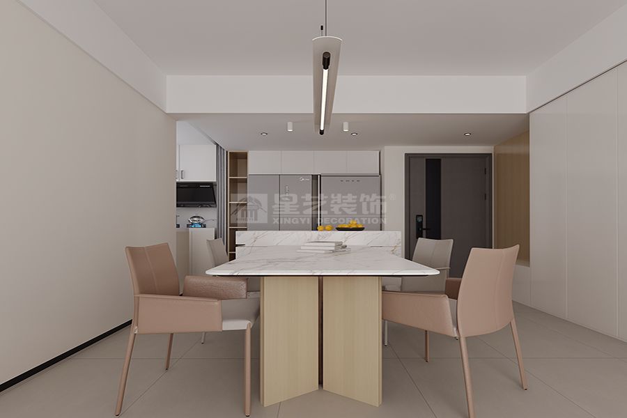 设计理念:开放、明亮、互动。 布局:采用开放式设计,连接餐厅和厨房,形成一个流畅的活动空间。 家具:选择简洁大方的家具,沙发和茶几的组合突显空间的宽敞感。 灯光:采用多层次的照明设计,包括主灯、射灯和落地灯,营造出温馨的氛围,。 装饰:通过简约的装饰画和绿植点缓,提升空间的艺术感和自然气息。