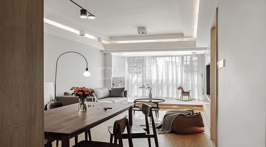 设计理念:开放、明亮、互动。 布局:采用开放式设计,连接餐厅和厨房,形成一个流畅的活动空间。 家具:选择简洁大方的家具,沙发和茶几的组合突显空间的宽敞感。 灯光:采用多层次的照明设计,包括主灯、射灯和落地灯,营造出温馨的氛围,。 装饰:通过简约的装饰画和绿植点缓,提升空间的艺术感和自然气息。