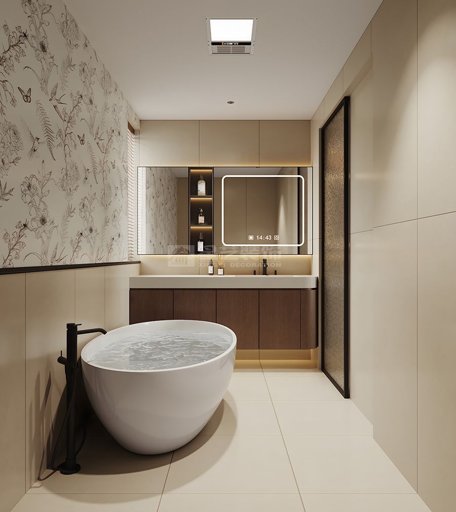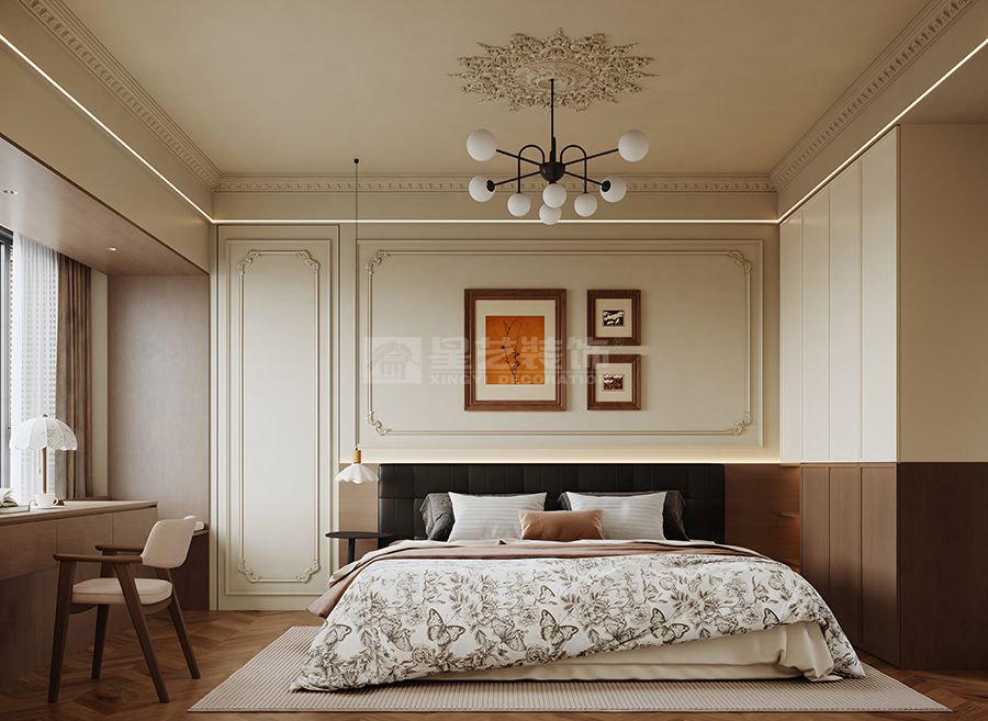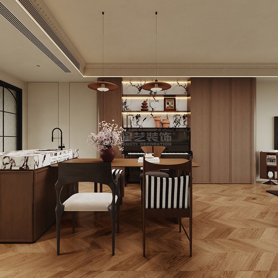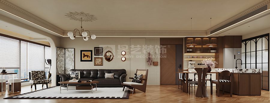 本设计以中古风为基调,融合现代美学与怀旧质感。空间采用开放式布局,客餐厨动线自然流畅。客厅以深棕皮沙发为核心,搭配几何造型吊灯、艺术挂画与藤编单椅,地面人字拼木地板呼应复古韵味;墙面石膏线、雕花细节彰显精致,黑白几何地毯提亮空间。餐厨区暖棕木质橱柜搭配玻璃柜门,中岛台兼顾实用与展示,餐椅的黑白条纹、藤编元素延续复古调性。百叶帘柔化光线,暖光照明营造温馨氛围,整体在复古情怀与现代舒适中达成平衡,塑造雅致且充满生活温度的居住场景。