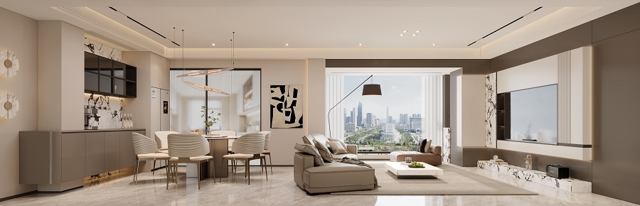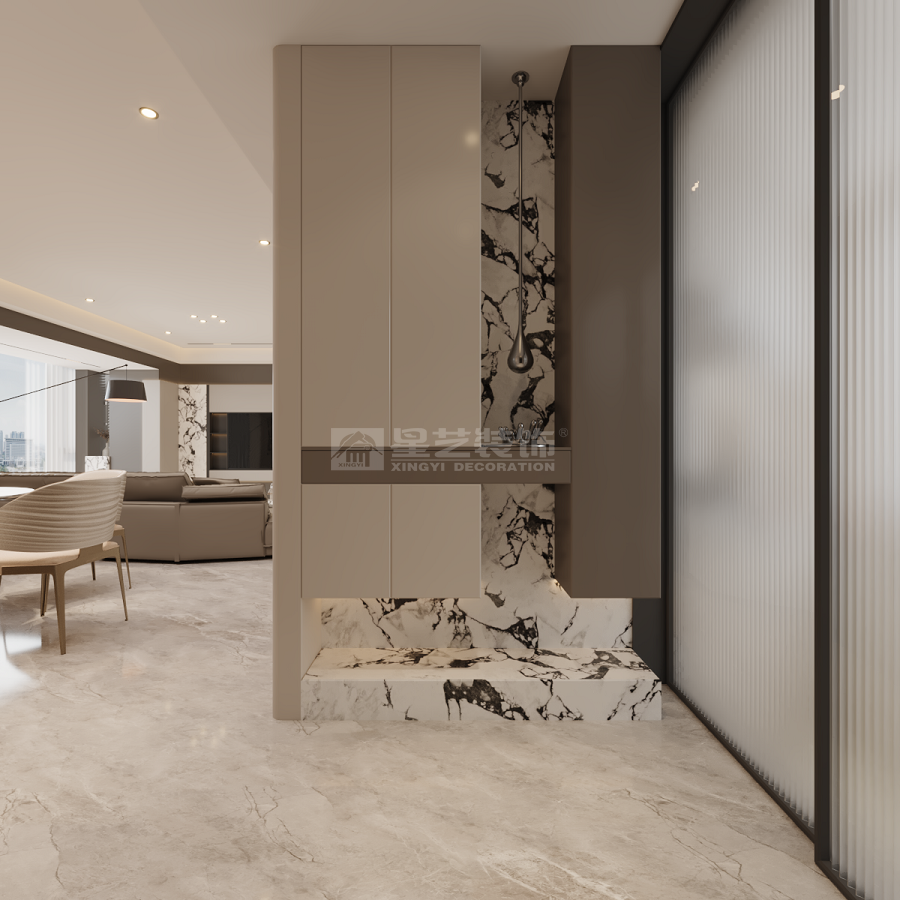 软装定位现代轻奢风,以黑白灰为基调,融入香槟金、浅咖等高级色系,材质上以哑光布艺、岩板为主体,搭配金属、长虹玻璃提升质感。家具造型简约而不失精致,软装以艺术挂画、简约花艺、质感灯具作点缀,少而精的陈设兼顾颜值与实用,营造低调奢华、简约有格调的现代居所。