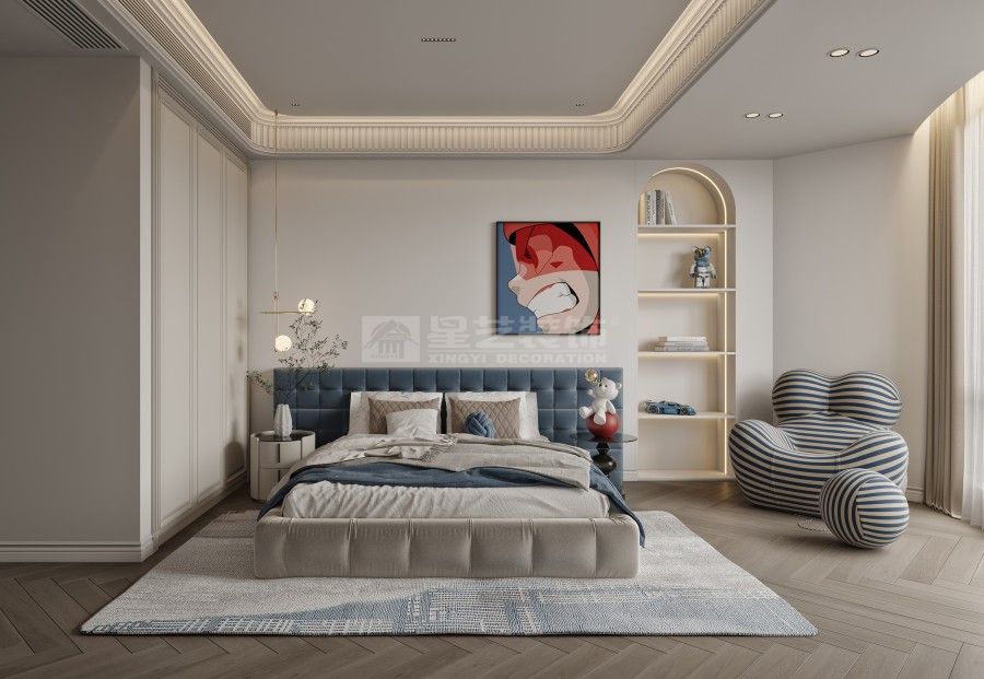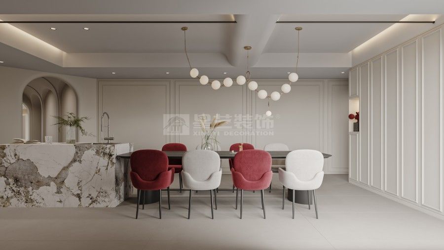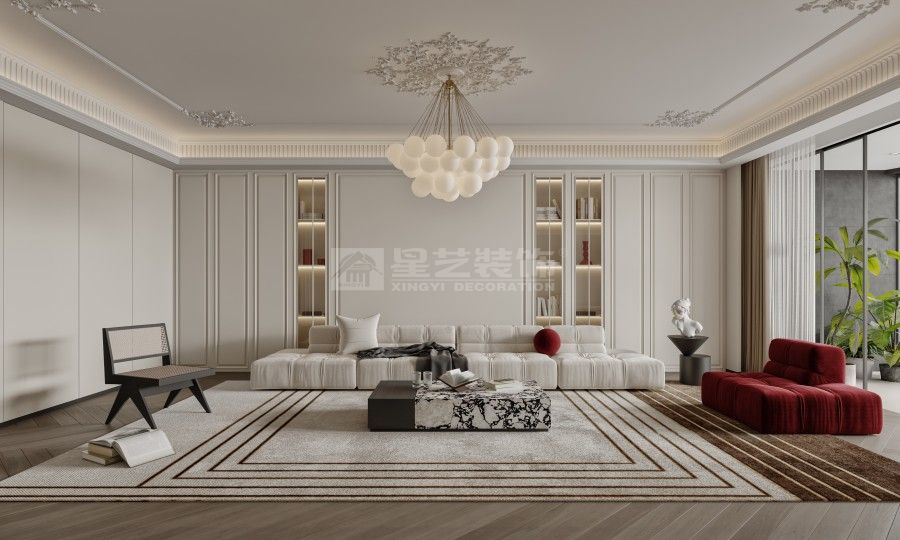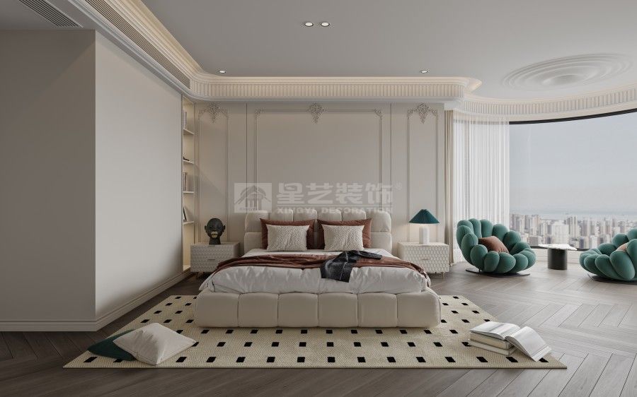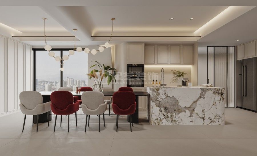 客厅是受阳面最大的空间,且坐拥无敌江景奶油色的护墙板搭配去轻盈感十足的家具, 将空间自身蕴含的能量更进一步拔高。