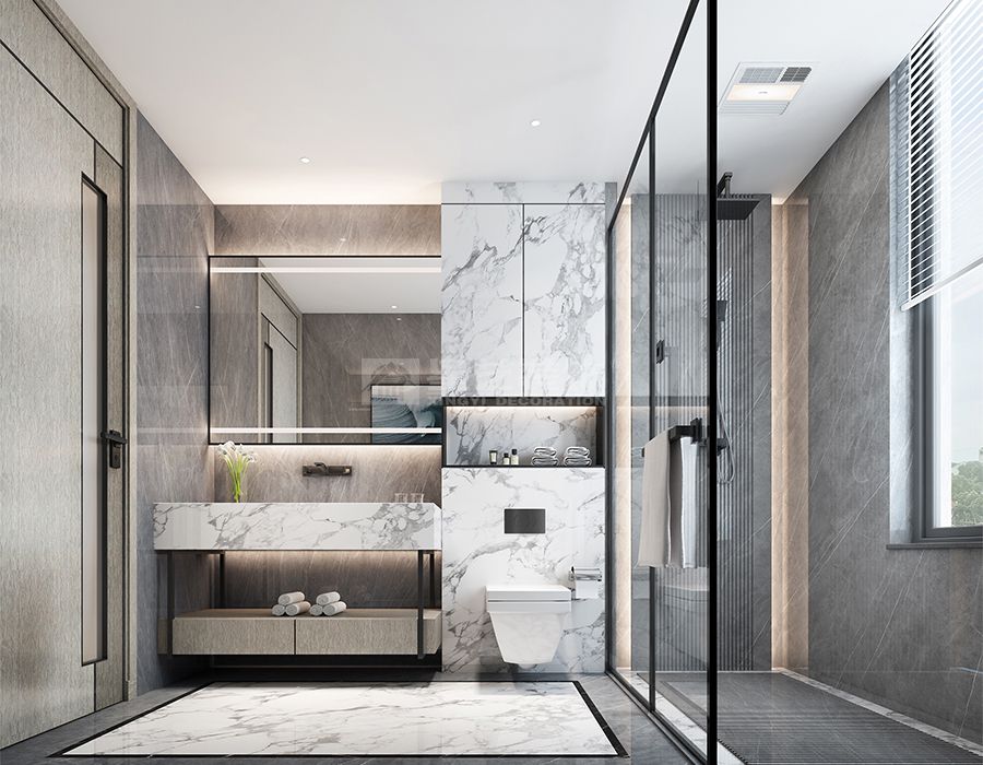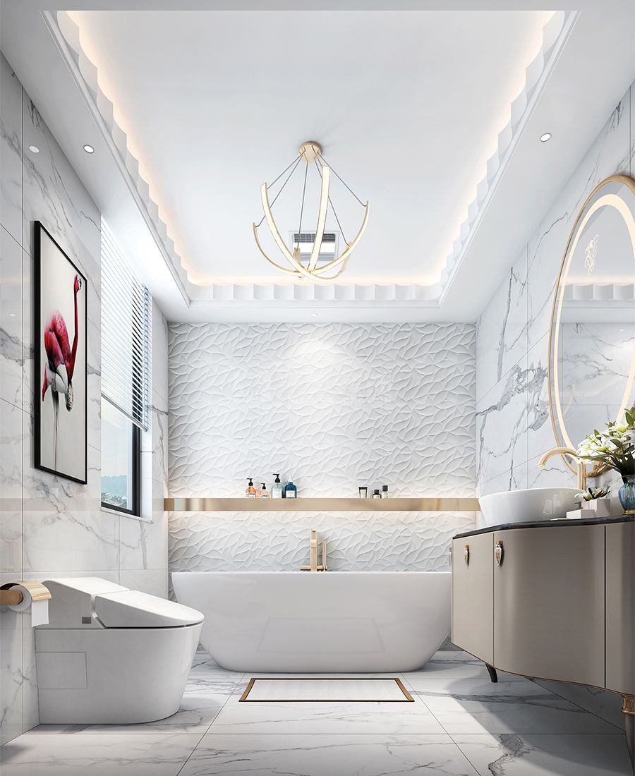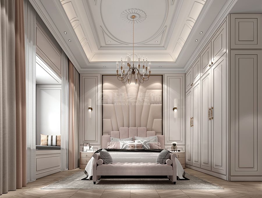 女儿房及专属卫生间则切换为法式风格,柔美的石膏线、浪漫的碎花软装搭配奶白色调,勾勒出少女心的绮梦天地。两种风格互不割裂,顶楼的开阔格局为其提供过渡纽带,既满足长辈对东方雅致的偏爱,亦圆了孩子对法式浪漫的憧憬,让一家三代的居住理想在此妥帖安放。