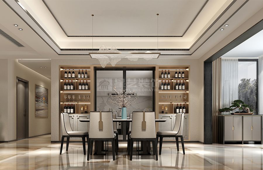 客餐厅与主卧沿用现代中式风格,摒弃传统中式的繁复厚重,以简洁线条勾勒空间骨架,木色家具与留白墙面相映成趣。客厅背景墙选用现场定制中式画,笔墨间的山水意境与窗外天光相融,营造出“结庐在人境,而无车马喧”的静谧氛围,于细节处彰显东方人居的雅致格调。