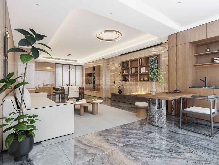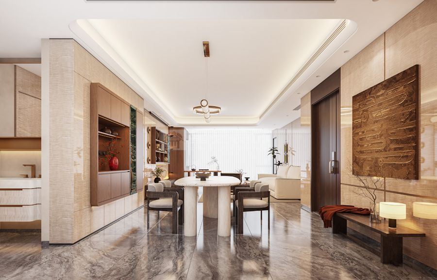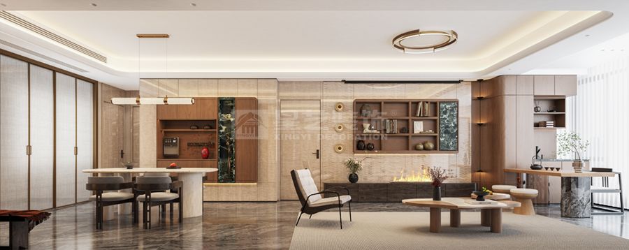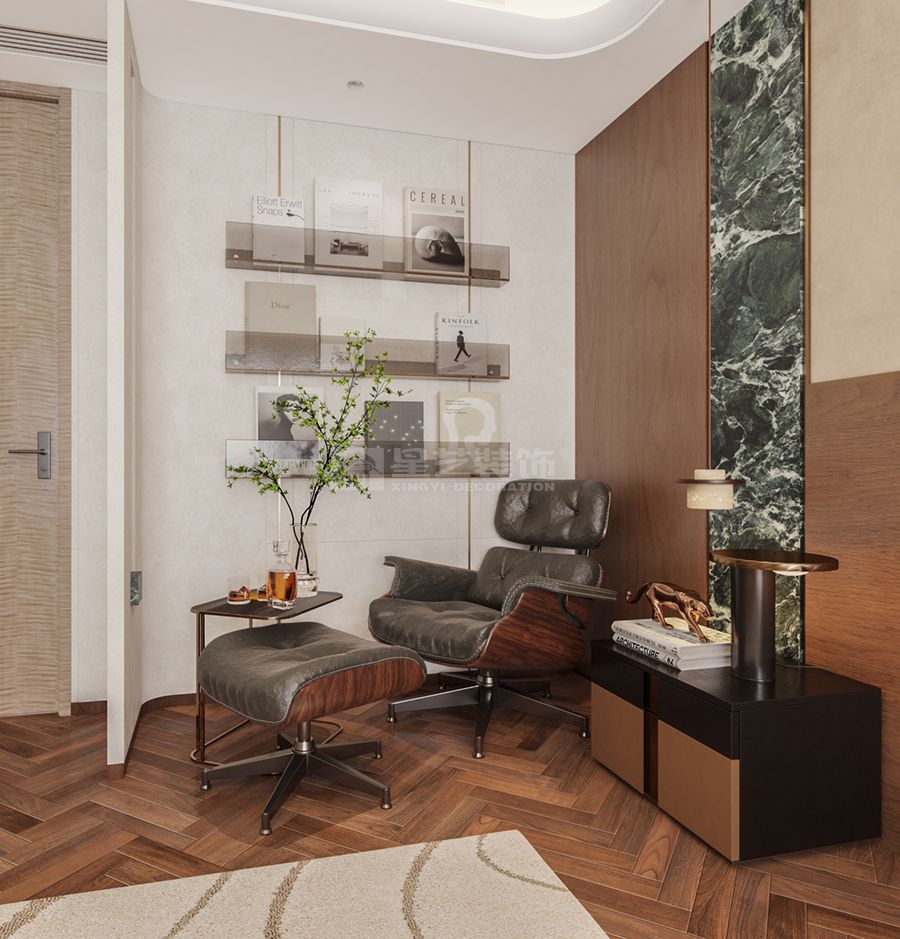 延续精装房的影木护墙板,叠加胡桃木色家具与墨绿色石材点缀,金属线条勾勒细节,营造出复古而矜贵的空间氛围,体现老钱风不张扬的优雅底蕴。