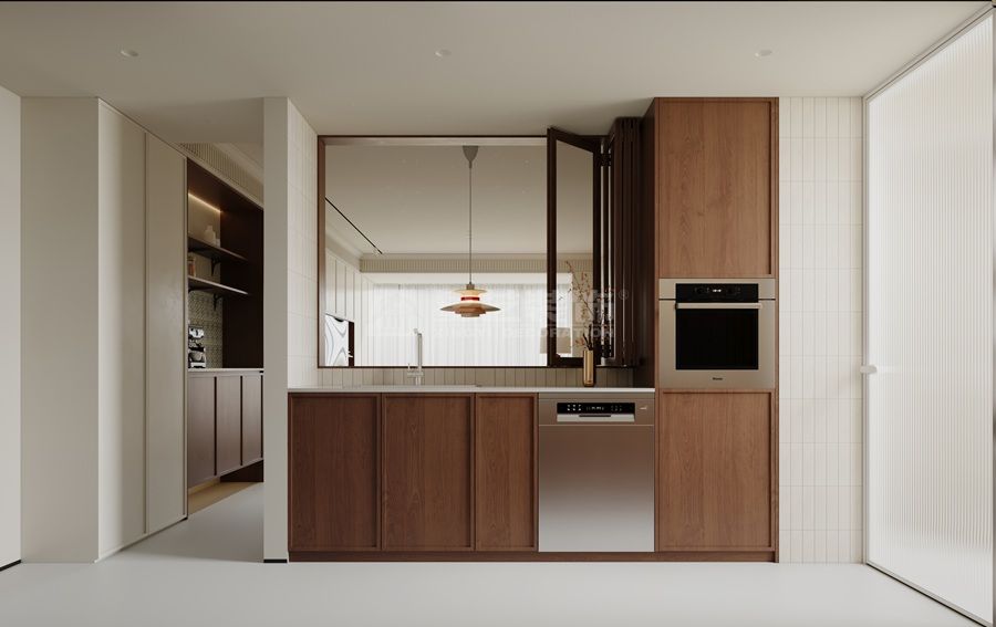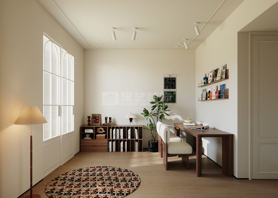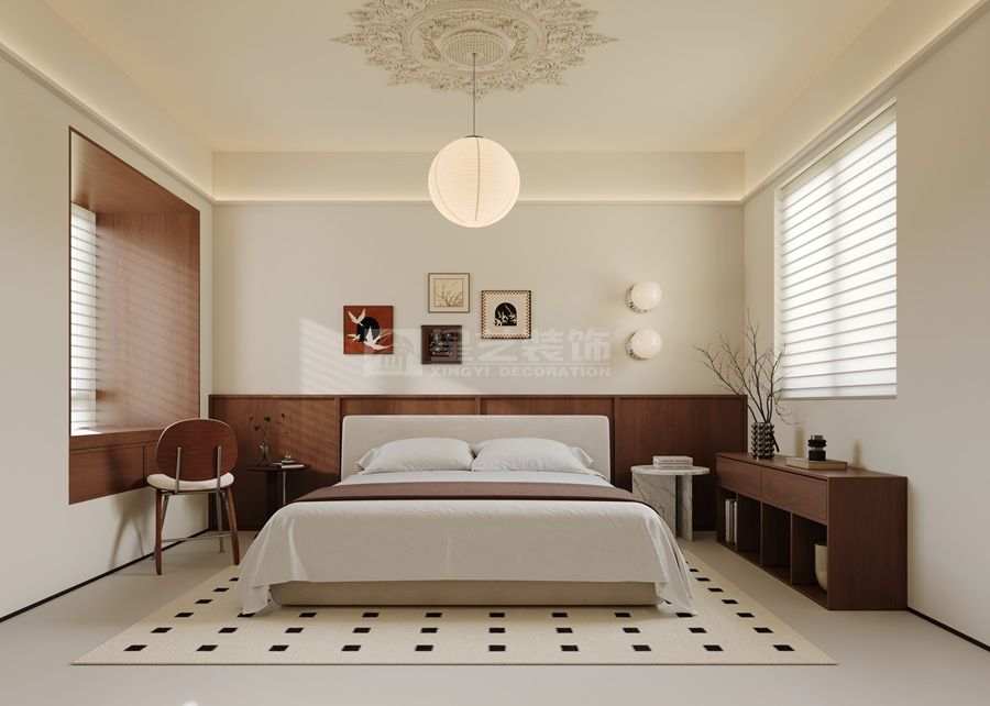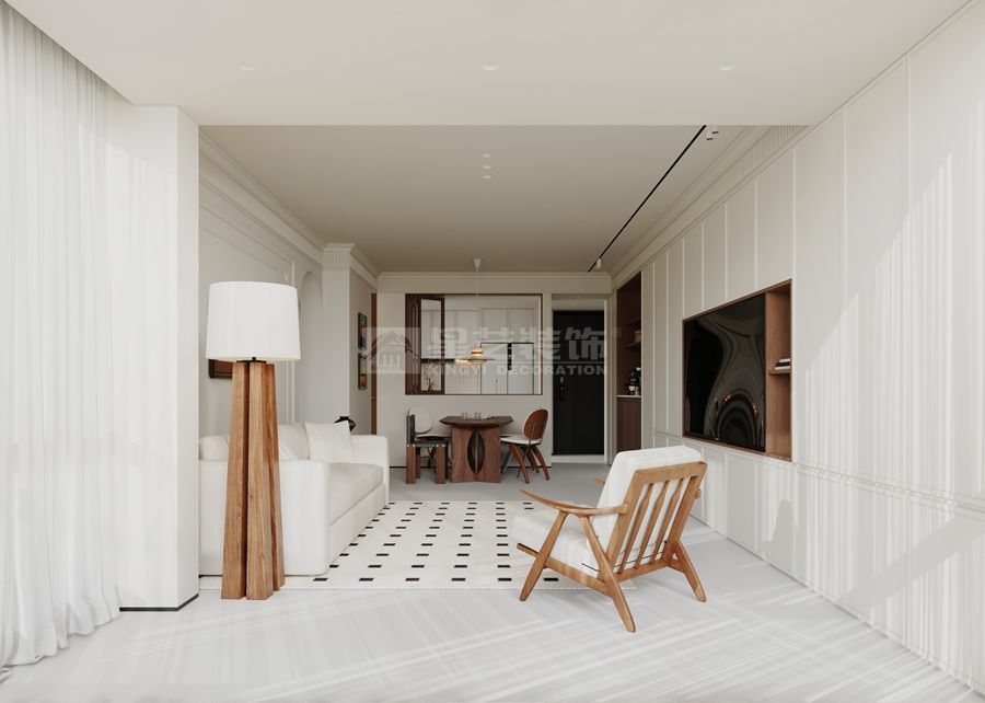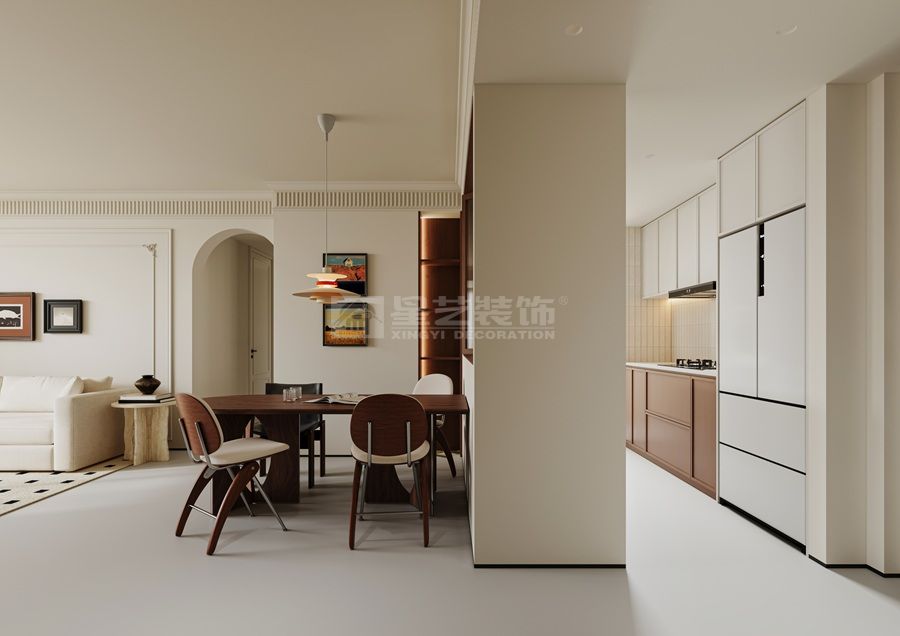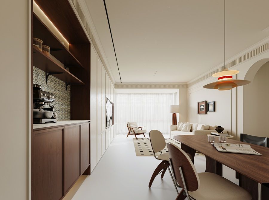 法式复古设计并非简单复刻古典法式元素,而是将经典法式的优雅底蕴与现代生活的实用需求融合,在保留复古韵味的同时打造适配当代的居住体验,提取法式经典的石膏线条、护墙板、雕花纹理等元素,简化繁复的传统雕花为简约的墙面分格与线条装饰,摒弃厚重的复古家具,搭配轻盈的现代木质桌椅,让法式复古摆脱“老派”感,适配现代客餐一体化的空间布局。以奶油白为基底,搭配深胡桃木(焦糖棕)的复古木调,局部融入花砖的复古花纹作为点缀,形成“柔白+浓木色”的经典法式色彩组合;材质上结合哑光墙面、木质家具与金属灯具配件,通过质感对比强化复古层次,又不失现代的简洁。