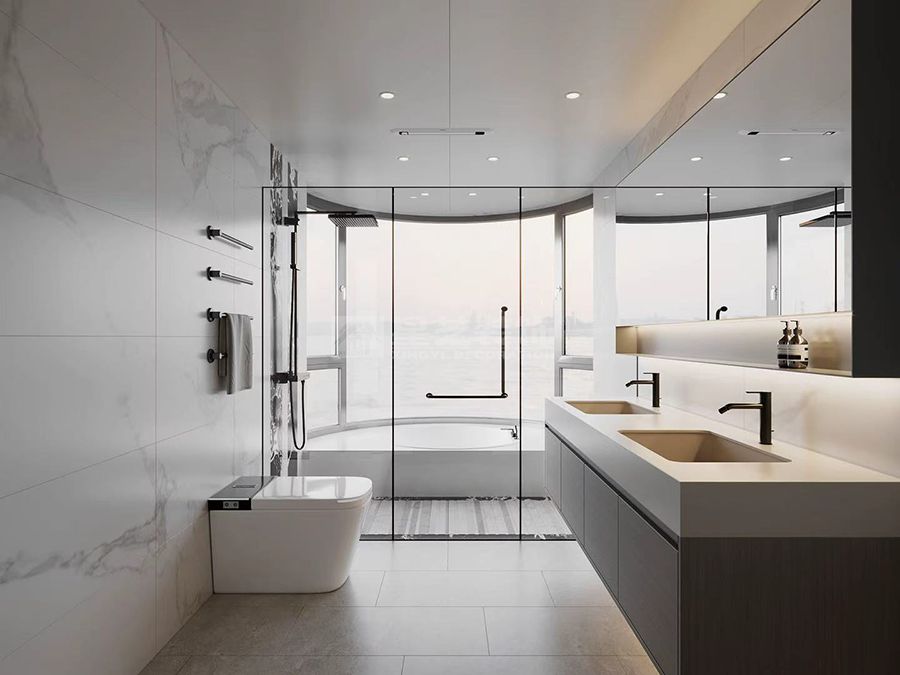 设计以深灰大理石、深棕木饰面为空间基底,通过材质的自然肌理营造视觉层次:客餐厅通铺的深色石材利落大气,搭配木饰面电视背景墙,冷硬与温润的碰撞消解了深色调的压抑;卧室以浅灰软包、木色柜体平衡深色床品,在静谧中保留休憩空间的柔和;厨卫区域则用玻璃、岩板等现代材料打造通透感,隐藏式收纳与极简线条进一步强化了空间的整洁与利落。